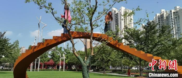 作品《世界橋》 :一座螺旋橋穿過(guò)一棵樹(shù),邀請(qǐng)人們?cè)诓煌嵌?、不同時(shí)間探索建筑與自然的密語(yǔ)。(中新網(wǎng)記者 陳靜攝)