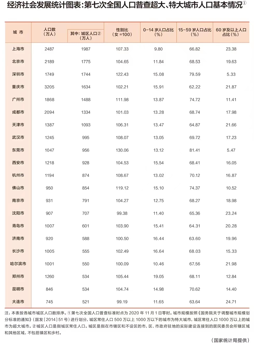 2021年9月,國(guó)家統(tǒng)計(jì)局根據(jù)2020年全國(guó)人口普查數(shù)據(jù),通過《求是》雜志發(fā)布了全國(guó)超大和特大城市名單。