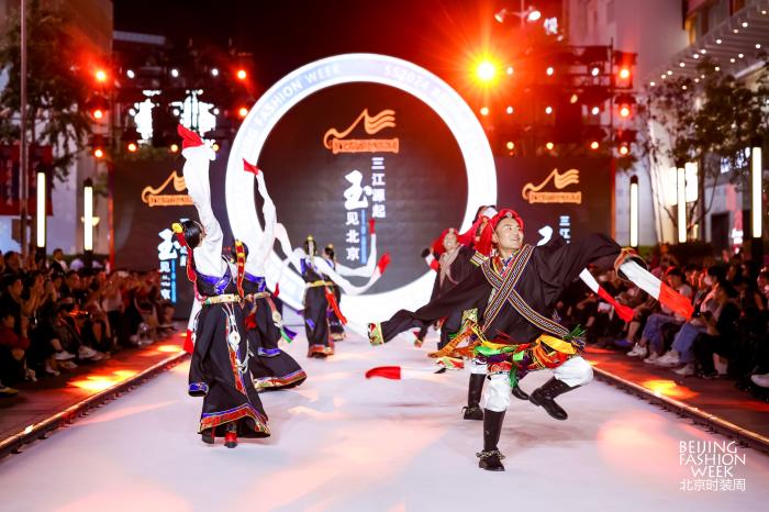 9月19日晚上9點(diǎn)的北京王府井大街,SS2024北京時(shí)裝周“三江源起,‘玉’見北京”北京玉樹文化交流月主題大秀在這里上演。