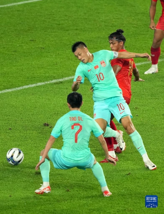 9月21日,中國隊球員譚龍(左一)在比賽中慶祝本場第一粒進球。