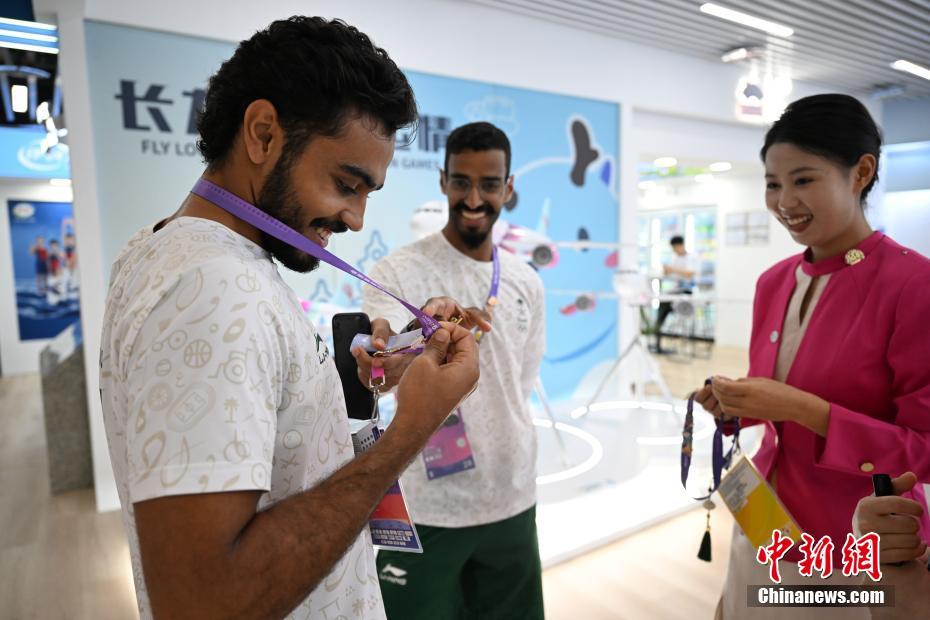 9月21日,浙江杭州,沙特運(yùn)動員與運(yùn)動員村內(nèi)工作人員交換徽章。中新社記者 趙文宇 攝