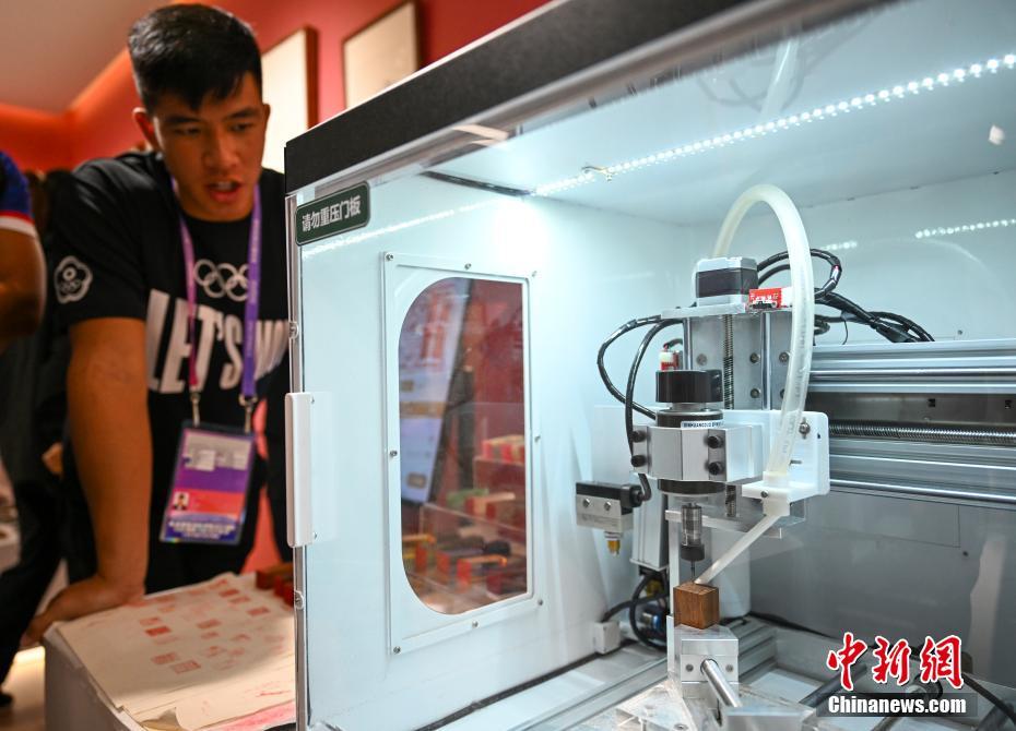 9月21日,浙江杭州,中國臺北運(yùn)動員王家憲在運(yùn)動員村體驗(yàn)印章刻制。杭州第19屆亞運(yùn)會期間,運(yùn)動員在運(yùn)動員村內(nèi)感受多樣生活。中新社記者 趙文宇 攝
