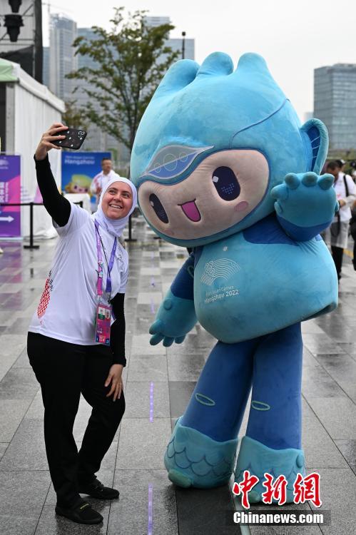 9月21日,浙江杭州,杭州第19屆亞運(yùn)會運(yùn)動員村內(nèi)舉行代表團(tuán)歡迎儀式,歡迎入住運(yùn)動員村的代表團(tuán)。當(dāng)日,杭州亞運(yùn)會迎來代表團(tuán)單日入境最高峰。圖為約旦代表團(tuán)成員與杭州亞運(yùn)會吉祥物“宸宸”合影。中新社記者 趙文宇 攝