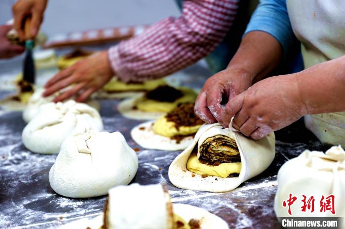 9月21日,在中秋佳節(jié)來臨之際,青海很多民眾制作月餅,來迎接這一傳統(tǒng)節(jié)日。青海傳統(tǒng)月餅制作時,將面粉發(fā)酵后,揉好搟開,上面涂上一層清油,撒上色香兼?zhèn)涞南愣狗?、紅曲、姜黃等,用手攤勻,揉成柱狀,團成面團。青海傳統(tǒng)月餅出爐后五色俱全,芳香可口。(中國新聞網(wǎng))
