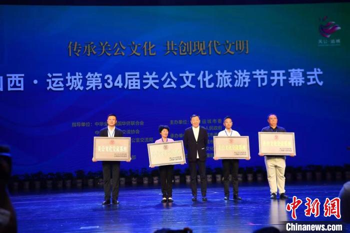 開幕式上,遼寧海城山西會館、福建泉州惠安登庸武廟、江蘇土山關(guān)帝廟、富士康(晉城)科技工業(yè)園等4家單位獲頒“關(guān)公文化交流基地”牌匾。