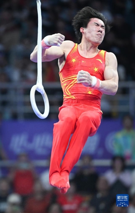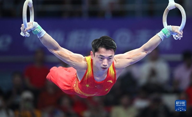 9月24日,中國(guó)隊(duì)選手張博恒在吊環(huán)項(xiàng)目比賽中。