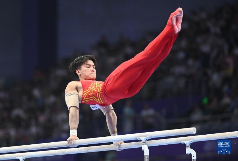 9月24日,中國(guó)隊(duì)選手林超攀在雙杠項(xiàng)目比賽中。