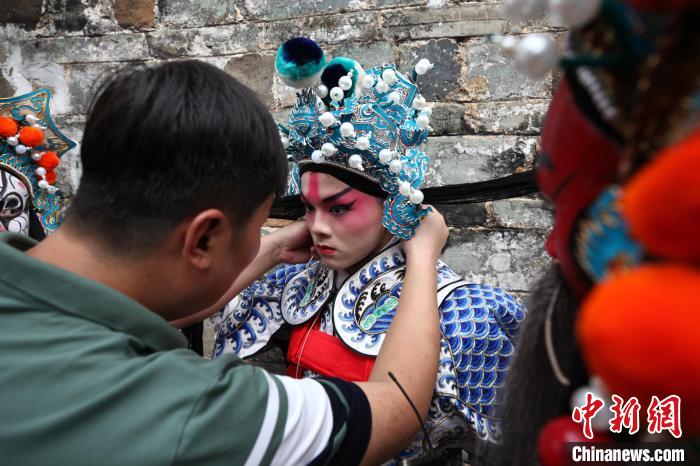 徽劇老師正在為小演員整理妝容。樊成柱 攝