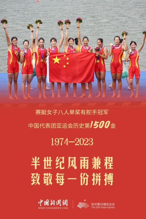 此后進(jìn)行的賽艇女子八人單槳有舵手決賽中,由張書(shū)賢、俞思源、鮑麗郡、董郗婭、張海蓉、劉曉鑫、王子鳳、徐星葉和徐霄韓組成的中國(guó)隊(duì)以6分33秒61的成績(jī)收獲金牌。這是中國(guó)體育代表團(tuán)亞運(yùn)會(huì)歷史第1500枚金牌。
