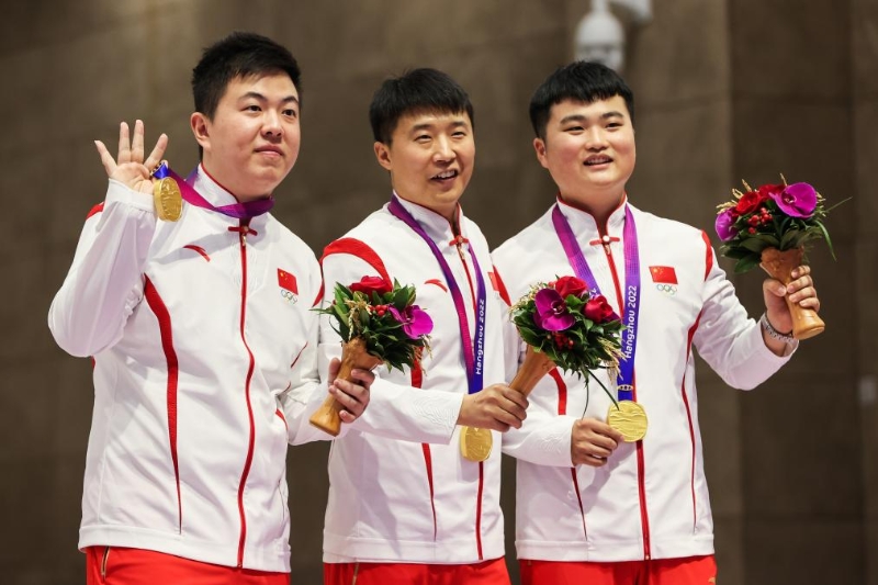 射擊賽場成為當(dāng)天“最靚的舞臺(tái)”,先是印度隊(duì)在男子10米氣步槍團(tuán)體賽中以1893.7環(huán)的成績打破世界紀(jì)錄,摘得金牌,這也是本屆亞運(yùn)會(huì)上創(chuàng)造的首個(gè)世界紀(jì)錄;隨后,中國隊(duì)的18歲小將盛李豪在該項(xiàng)目的個(gè)人賽中以253.3環(huán)的成績刷新世界紀(jì)錄并奪冠。緊接著的男子25米手槍速射爭奪中,王鑫杰、劉楊攀、李越宏組成的中國隊(duì)以1765環(huán)的破世界紀(jì)錄成績奪得團(tuán)體冠軍,老將李越宏還摘得該項(xiàng)目的個(gè)人金牌。