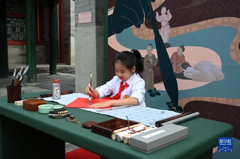 9月25日,小學(xué)生在展覽現(xiàn)場練習(xí)毛筆字。