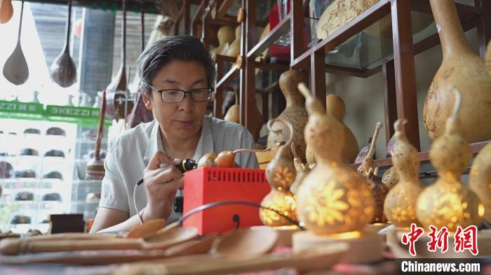 “我小時(shí)候,城里的房子也是平房,我們?cè)谠鹤永镏咸鸭茏?,種葡萄樹(shù)苗、葫蘆瓜之類(lèi)的植物。但是,我們?cè)谵r(nóng)村有親戚,秋天的時(shí)候每次去農(nóng)村都會(huì)帶很多葫蘆。我制作葫蘆時(shí),鄰居家的同學(xué)和親戚都說(shuō)好看,于是他們把家里的葫蘆都拿來(lái)給我,讓我給他們做了一個(gè)葫蘆手工藝品,從那以后我對(duì)葫蘆藝術(shù)格外感興趣?!蹦驹翣枴ぐ箍栒f(shuō)道。