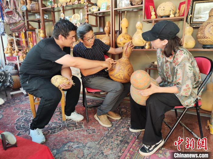 非遺傳承人木扎帕爾·艾斯卡爾正在雕刻葫蘆作品。( 劉兵兵 攝)