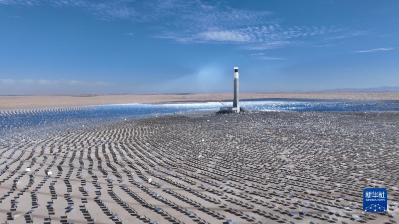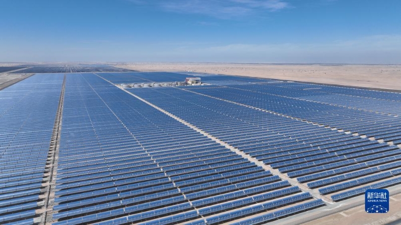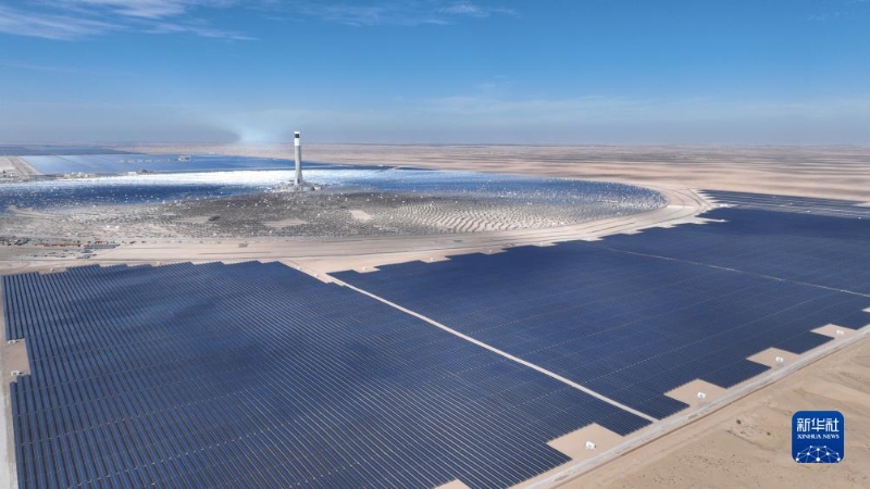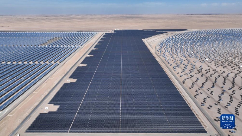 這是上海電氣迪拜光熱光伏復(fù)合項(xiàng)目(2023年7月25日攝,無人機(jī)照片)。