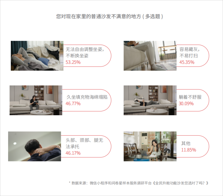 基于以上問卷調(diào)研和匯總2023年9月23日全民升艙白皮書第二冊《頭等艙生活方式趨勢報告》于北京北沙灘紅星美凱龍商城正式發(fā)布。白皮書的走訪調(diào)研發(fā)現(xiàn),在當前沙發(fā)消費步入頭等艙時代的新趨勢下,普通沙發(fā)的功能缺陷,導致其已無法滿足人們?nèi)諠u豐富的使用需求,這對許多消費者感受更美好生活造成了阻礙。