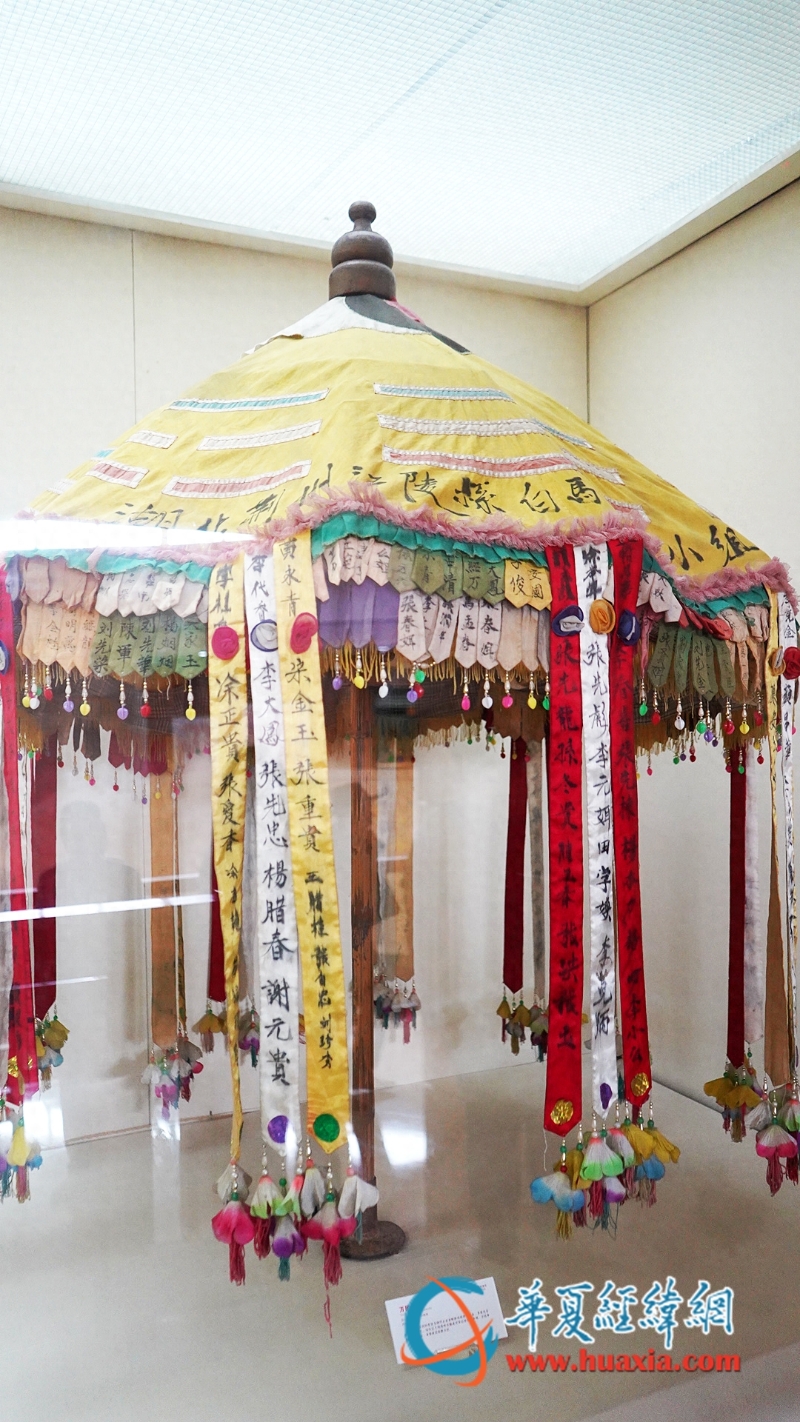香俗文化展廳,展出了許多朝山進(jìn)香的令旗、萬(wàn)民傘,還有民間朝山進(jìn)香進(jìn)獻(xiàn)給真武大帝的神冠、瓷燒壽桃。另外,朝山許大愿用的鎖口劍也是首次展出。(黃楊)