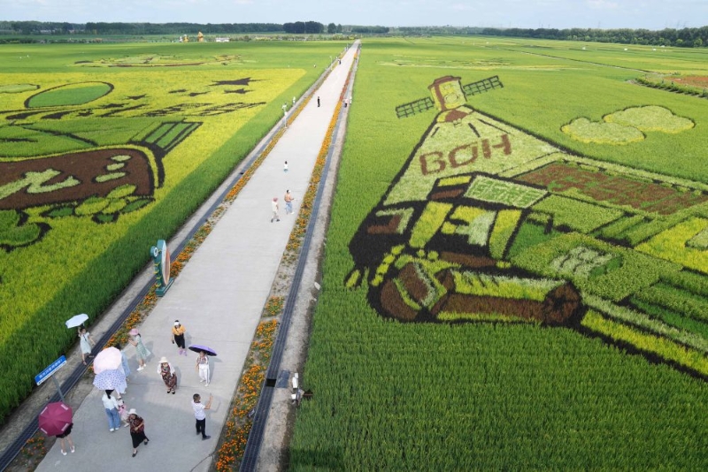 游客在北大荒集團(tuán)閆家崗農(nóng)場(chǎng)有限公司農(nóng)業(yè)現(xiàn)代化示范區(qū)的稻田里游覽(2023年8月10日攝)。新華社記者 王建威 攝
