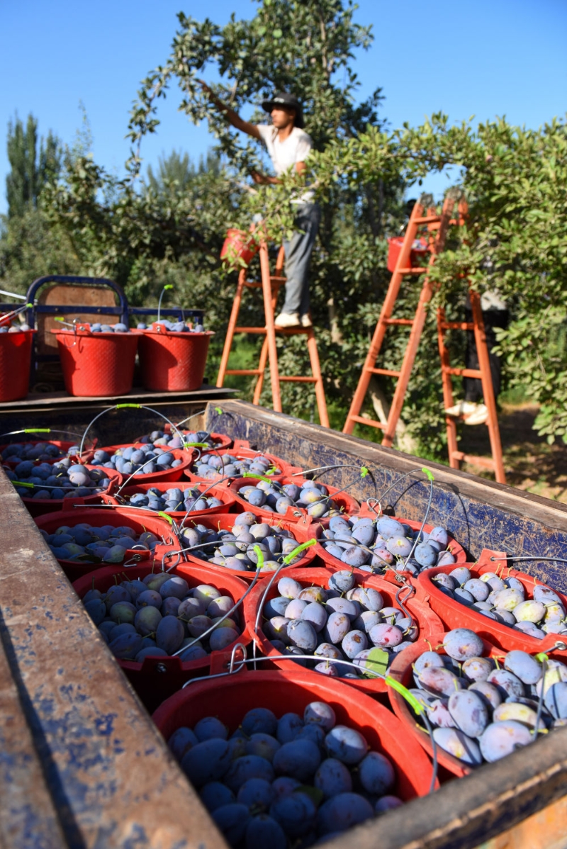 在新疆伽師縣英買(mǎi)里鎮(zhèn)巴格托格拉克村,果農(nóng)在采摘新梅(2023年8月4日攝)。新華社記者 丁磊 攝