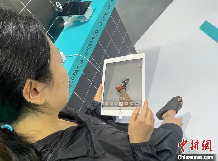 在得物App展臺(tái),利用AR(增強(qiáng)現(xiàn)實(shí))技術(shù)的“虛擬試穿戴體驗(yàn)”十分有趣。參觀者在智能設(shè)備上選定鞋款后,不用脫鞋穿鞋,只需“掃一掃”,在鏡頭前伸出腳,就能看到鞋子上腳的模擬效果。