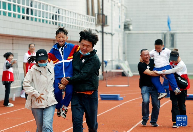 9月26日,小學(xué)生和家長(zhǎng)在進(jìn)行抬轎子親子游戲比賽。