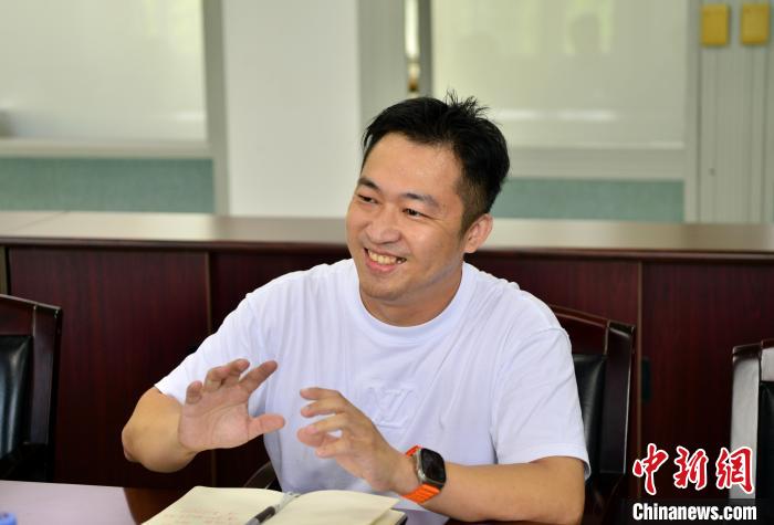 圖為林小緯在公司里向記者暢談“登陸”12年來(lái)的收獲及感悟?!≈行戮W(wǎng)記者 張斌 攝