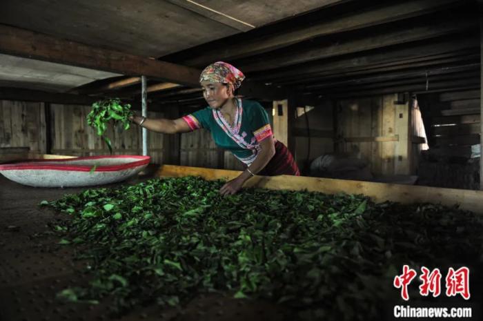 云南瀾滄景邁山,少數(shù)民族婦女在家里烘干茶葉。任東 攝
