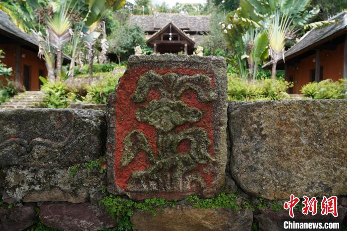 9月16日,云南普洱景邁山布朗族村寨中的一塊茶葉浮雕。中新社記者 劉冉陽 攝