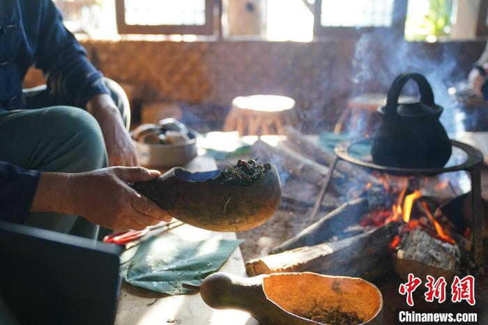 9月16日,云南普洱景邁山布朗族人在火塘邊制作烤茶。中新社記者 劉冉陽 攝
