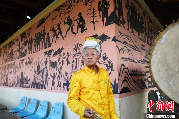 9月15日,蘇國文站在由其策劃繪制的布朗族歷史墻壁繪畫前。中新社記者 劉冉陽 攝