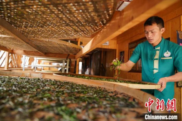 糯干古寨的村民巖查看室內晾干的茶葉。劉冉陽 攝
