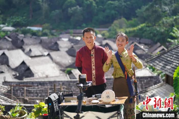 傣族姑娘仙金(右)和男朋友丁志雄(左)在糯干古寨進行網(wǎng)絡直播,向網(wǎng)友推介景邁山和自家出產的茶葉。劉冉陽 攝