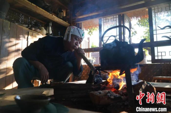 景邁山傳統(tǒng)手工制茶技藝市級傳承人南康坐在火塘邊,展示布朗族烤茶的制作過程。劉冉陽 攝