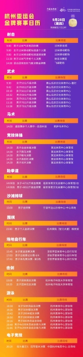 中新網(wǎng)9月28日電 28日,杭州亞運(yùn)會將在游泳、體操、射擊、武術(shù)等賽場產(chǎn)生35枚金牌。