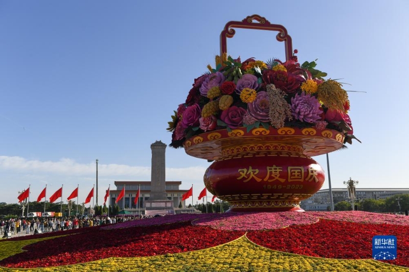 中秋及國慶節(jié)假期臨近,北京天安門廣場上的“祝福祖國”巨型花籃吸引著眾多市民游客參觀游覽。