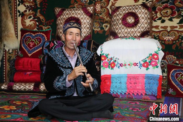 中新網(wǎng)烏魯木齊9月27日電 (喇小飛)走進新疆昌吉回族自治州吉木薩爾縣慶陽湖鄉(xiāng)大東溝村牧民、民間藝人加依拉吾·塔吾的家,只見繡著民族特色花紋的羊毛毯子上放著幾只管狀樂器。加依拉吾·塔吾告訴記者,這就是哈薩克族傳統(tǒng)樂器——斯布孜額。