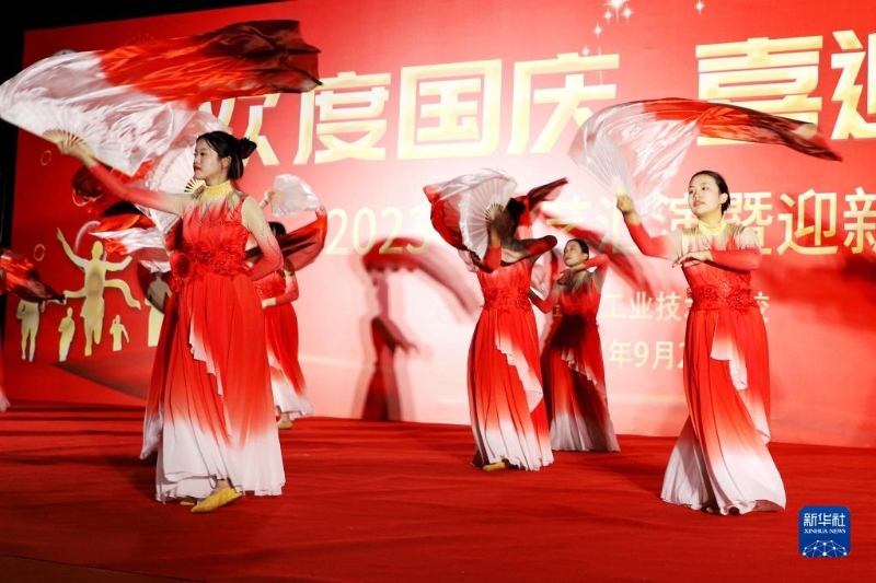9月26日,學(xué)生在山東省青島市工業(yè)技術(shù)學(xué)?!坝瓏鴳c”主題晚會上表演舞蹈。