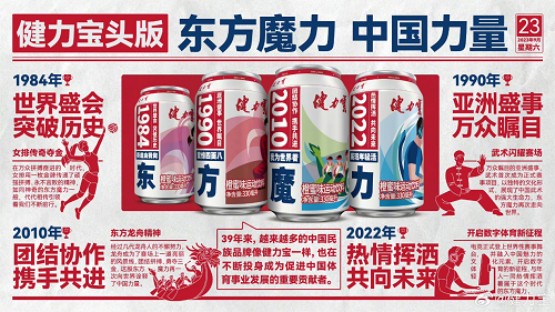 作為民族運(yùn)動(dòng)飲料的健力寶不僅為體育健兒們加油助威,還推出了全新9月盛事紀(jì)念款“東方魔力”罐。1984女排奪金、1990武術(shù)亮相、2010東方龍舟、2022電競(jìng)啟航,健力寶把中國(guó)體育運(yùn)動(dòng)盛事的閃耀時(shí)刻記錄下來(lái),融合到“東方魔力”中。