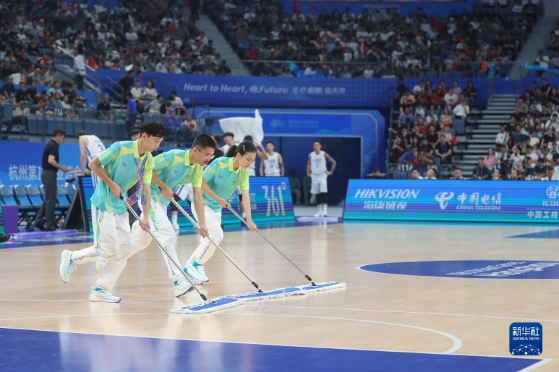 9月28日,志愿者在比賽前清潔場地。