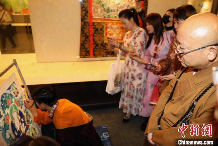 9月29日,“青海非遺·中秋聯(lián)歡”活動(dòng)在高雄佛光山佛陀紀(jì)念館舉行。圖為佛光山住持心保和尚與臺(tái)灣觀眾一同觀摩熱貢唐卡傳承人完德尖措現(xiàn)場(chǎng)創(chuàng)作。中新社記者 劉舒凌 攝