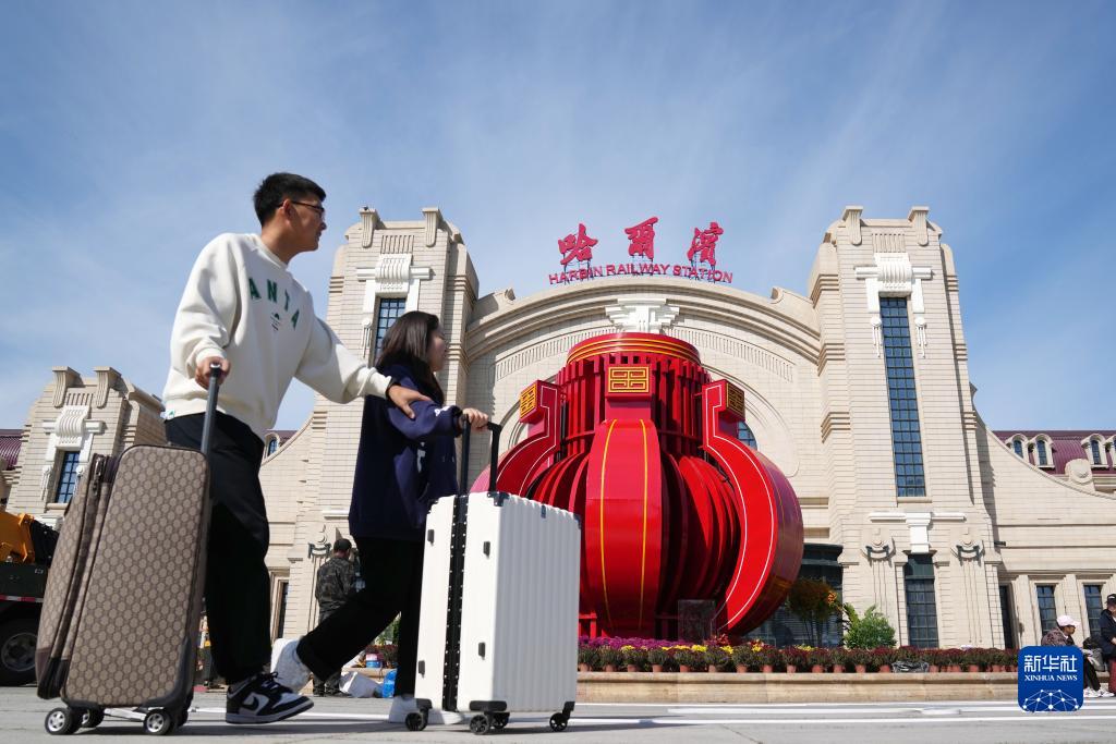 9月29日,旅客從哈爾濱火車站南廣場(chǎng)走過(guò)。