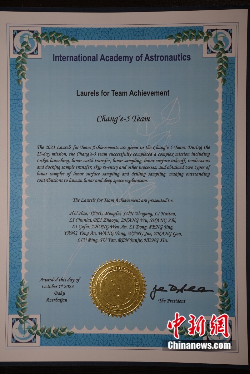 中新網(wǎng)北京10月2日電(馬帥莎)記者2日從國(guó)家航天局獲悉,10月1日,在阿塞拜疆巴庫(kù)舉辦的第74屆國(guó)際宇航大會(huì)(IAC)期間,國(guó)際宇航科學(xué)院主席舒馬赫等科學(xué)家為中國(guó)嫦娥五號(hào)團(tuán)隊(duì)頒發(fā)了“勞倫斯團(tuán)隊(duì)獎(jiǎng)”。嫦娥五號(hào)任務(wù)總設(shè)計(jì)師胡浩等作為團(tuán)隊(duì)代表出席頒獎(jiǎng)儀式,并宣布嫦娥五號(hào)月球科研樣品即將面向國(guó)際開放申請(qǐng),歡迎各國(guó)科學(xué)家共同研究,共享成果。