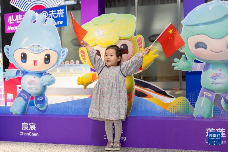 10月1日,小朋友在上海虹橋火車站候車區(qū)揮舞國旗。