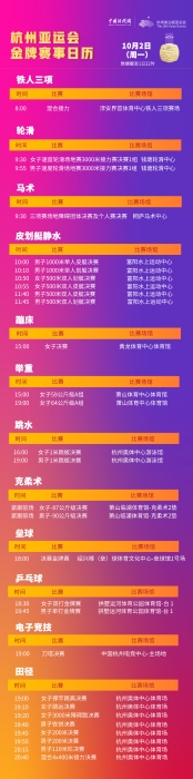 10月2日,已進(jìn)入賽事后半程的杭州亞運(yùn)會(huì)將在乒乓球、跳水、舉重、蹦床、田徑等項(xiàng)目上產(chǎn)生30枚金牌。