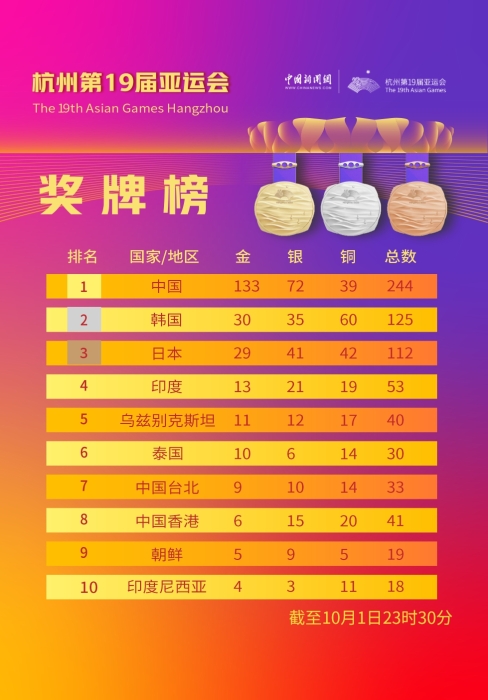 在1日的比賽中,中國(guó)體育代表團(tuán)單日收獲19金。獎(jiǎng)牌榜上,中國(guó)隊(duì)以133金72銀39銅斷層領(lǐng)先,獎(jiǎng)牌數(shù)量超日韓總和。(完)