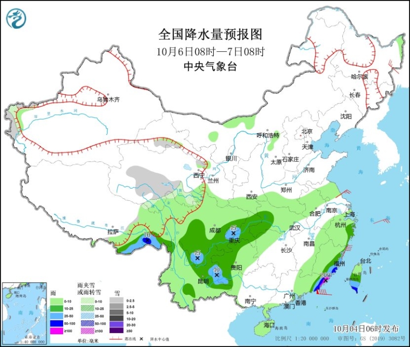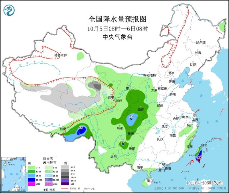 10月4日08時(shí)至5日08時(shí),新疆阿勒泰山區(qū)和南疆南部山區(qū)、西藏中西部、青海大部、甘肅西南部等地有小到中雪或雨夾雪,其中青海中南部部分地區(qū)有大到暴雪;臺(tái)灣島中東部有暴雨到大暴雨,局地特大暴雨(250-300毫米);甘肅中東部、陜西中南部、四川東北部、重慶大部、貴州北部、湖北西部等地有中到大雨,局地暴雨。內(nèi)蒙古中東部、東北地區(qū)大部等地部分地區(qū)有4~6級(jí)風(fēng)。