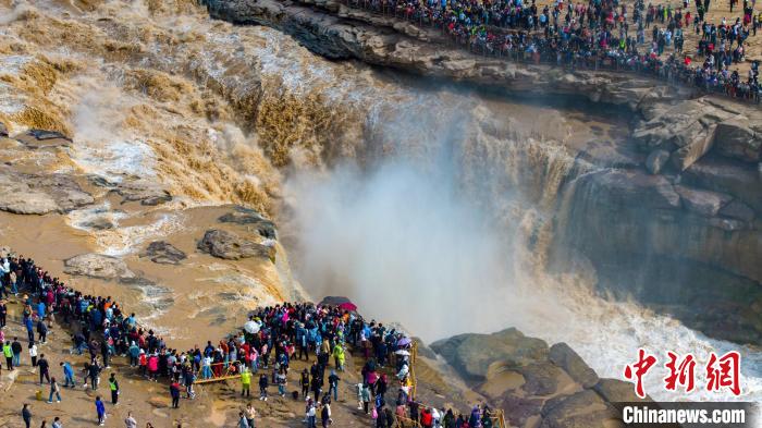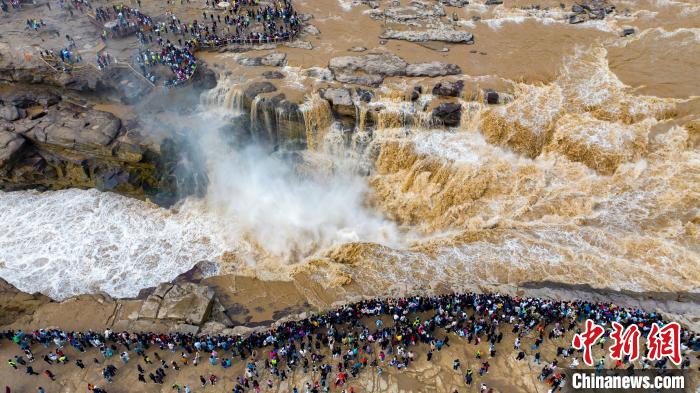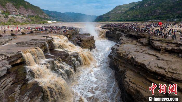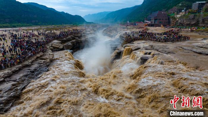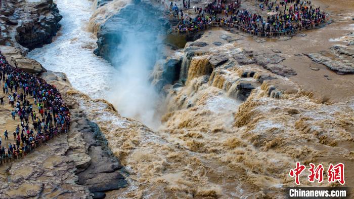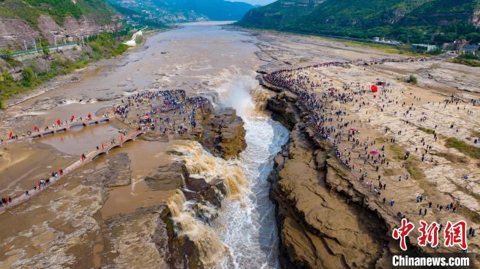 中秋國(guó)慶假期,位于秦晉峽谷的黃河壺口瀑布水流持續(xù)上漲,滔滔黃河水涌至秦晉峽谷,躍進(jìn)壺底,出現(xiàn)濁浪滔天、金流飛瀑景觀,吸引游客拍照留念。