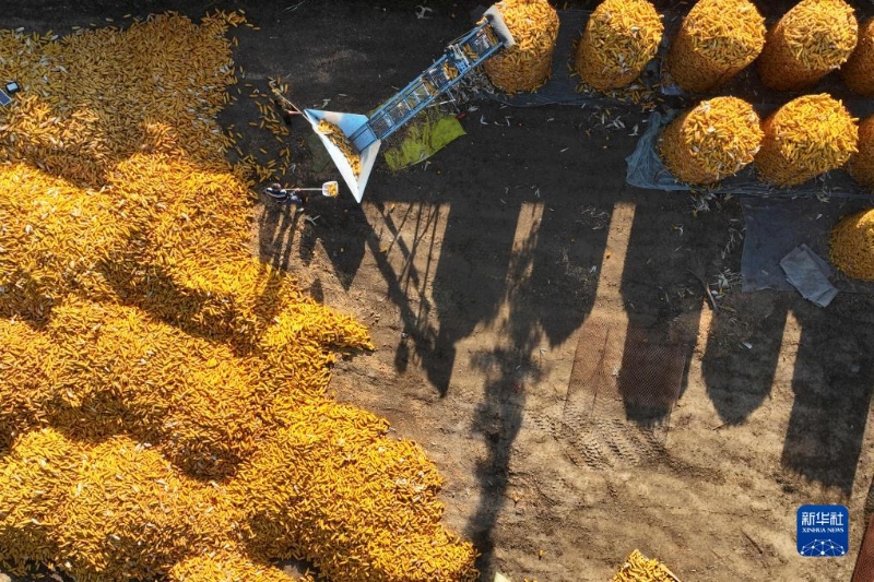 10月5日,在河北省石家莊晉州市周家莊鄉(xiāng)第七生產(chǎn)隊,農(nóng)民在晾曬收獲的玉米。新華社發(fā)(賈再興攝)