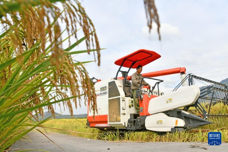10月5日,浙江省臺州市仙居縣白塔鎮(zhèn)農(nóng)民在收割水稻。新華社發(fā)(王華斌攝)