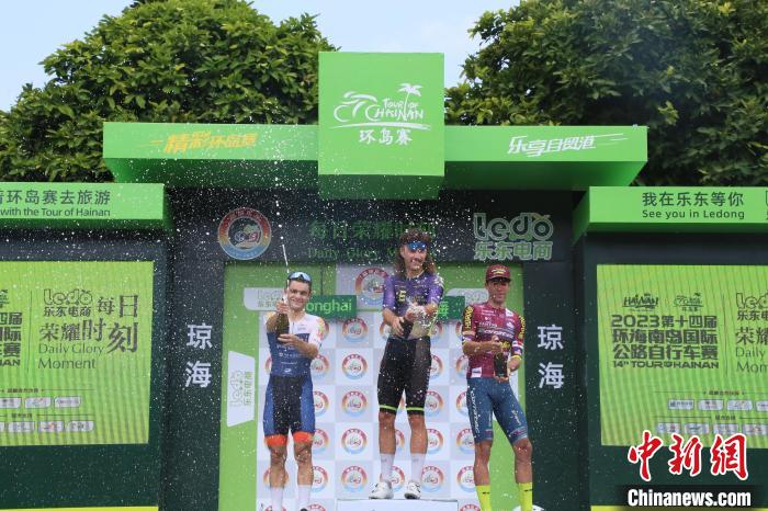 10月5日,2023第十四屆環(huán)海南島國(guó)際公路自行車(chē)賽在海南瓊海開(kāi)賽。圖為獲得第一賽段瓊海賽段的前三名車(chē)手冠軍喬治·杰克遜(中)、亞軍尼古拉斯(右)、季軍盧卡斯·卡斯滕森(左)噴灑香檳慶祝。中新網(wǎng)記者 符宇群 攝