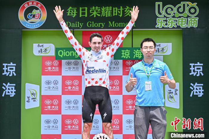 10月5日,2023第十四屆環(huán)海南島國(guó)際公路自行車(chē)賽在海南瓊海開(kāi)賽。圖為獲得第一賽段瓊海賽段“圓點(diǎn)衫”的哥倫比亞麥德林車(chē)隊(duì)車(chē)手奧斯卡·塞維利亞。環(huán)海南島國(guó)際公路自行車(chē)賽組委會(huì) 供圖